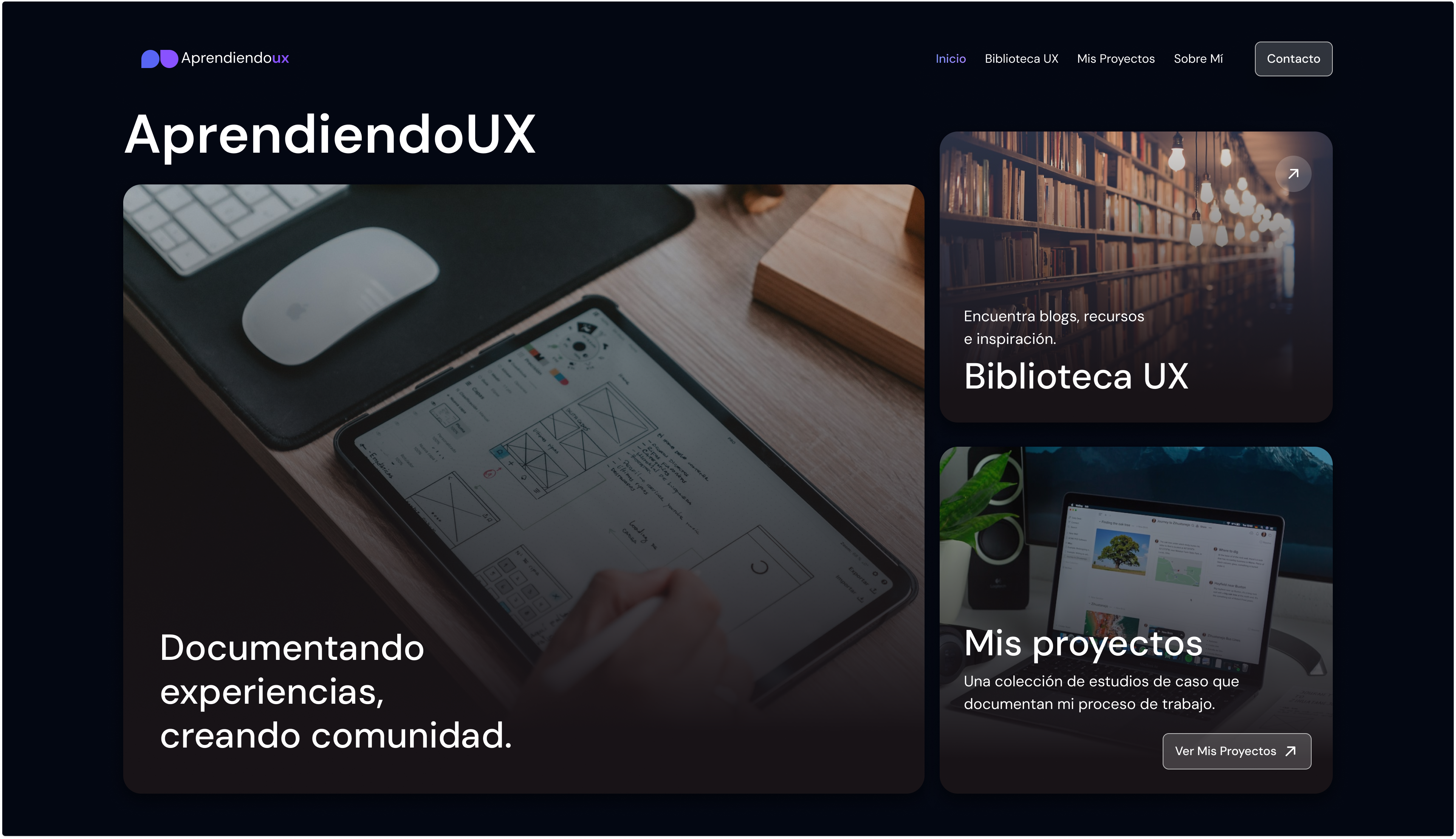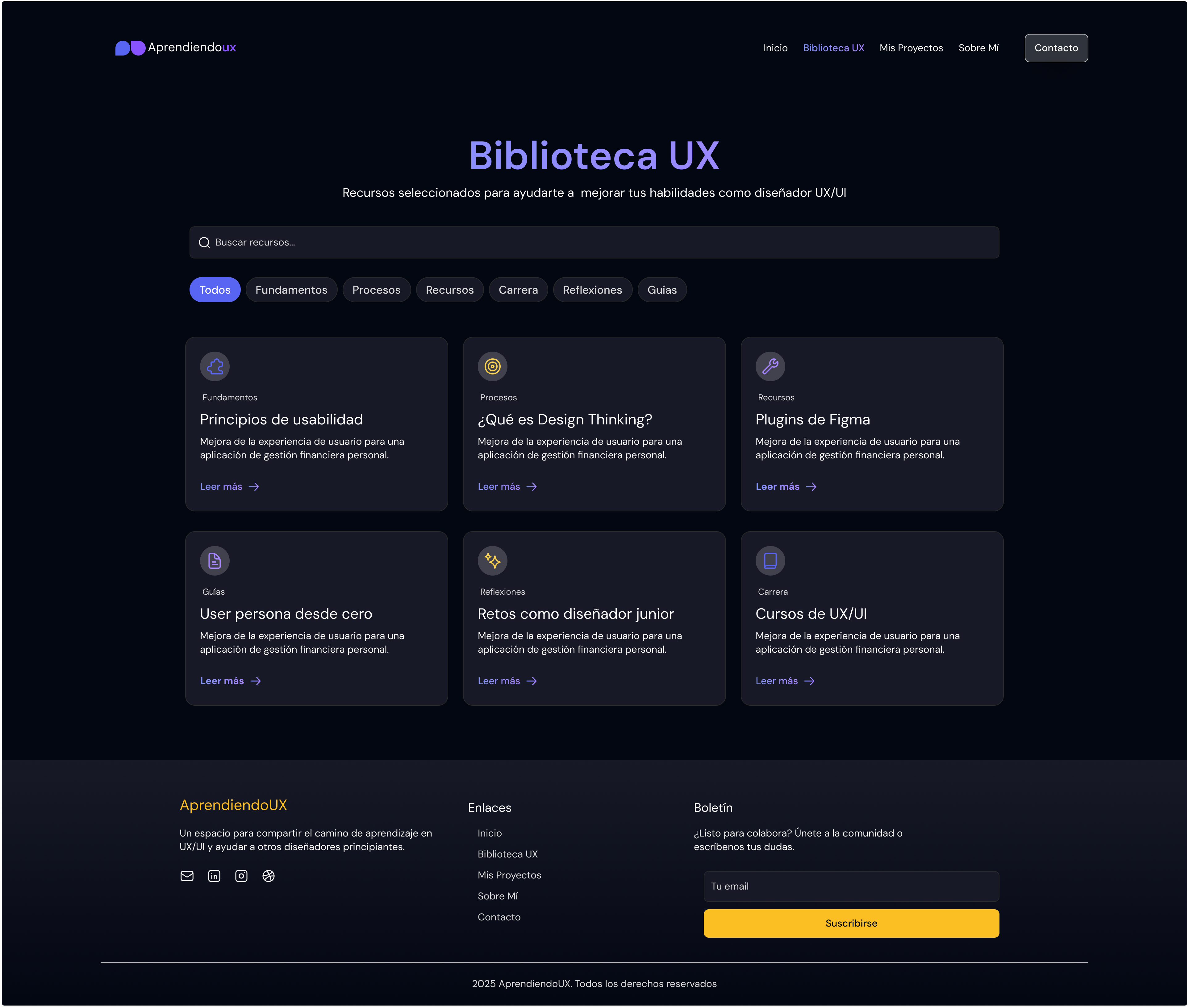 Este proyecto personal se centró en la Arquitectura de la Información (IA) como pilar fundamental. El reto fue diseñar una experiencia de contenido que fuera intuitiva y fácil de navegar. Me enfoqué en la categorización lógica (Biblioteca UX) y la jerarquía visual para asegurar que el usuario (diseñador junior) encuentre recursos y proyectos sin fricciones.